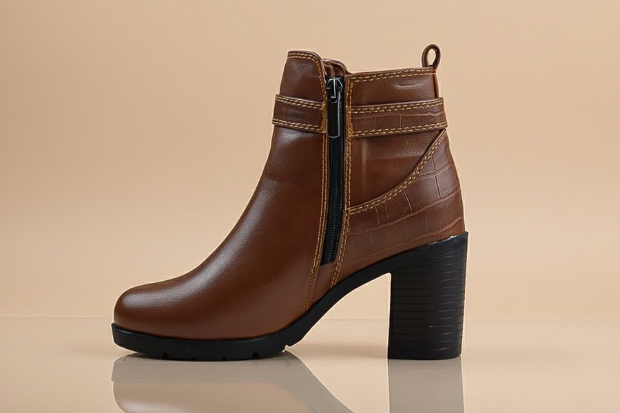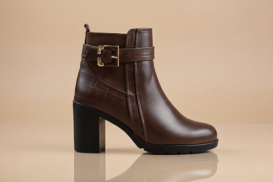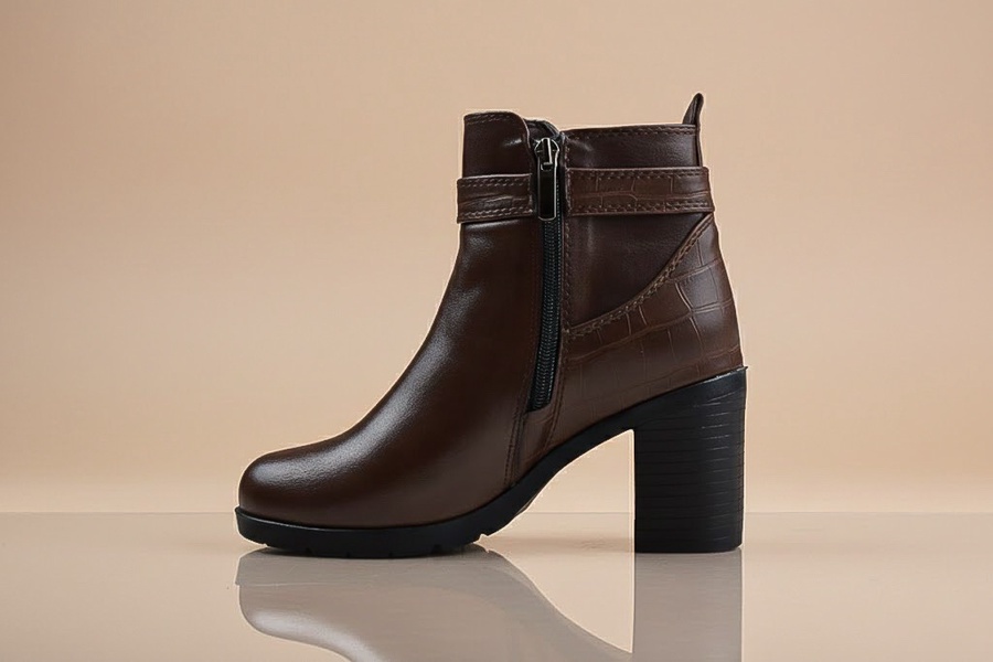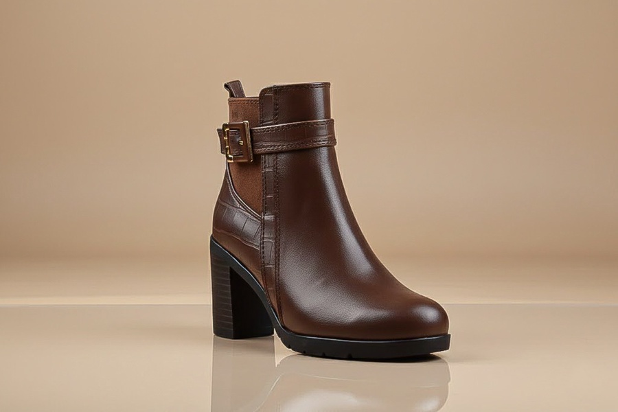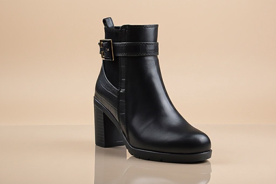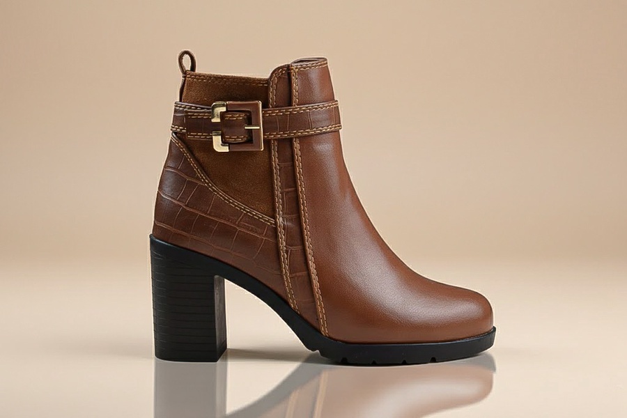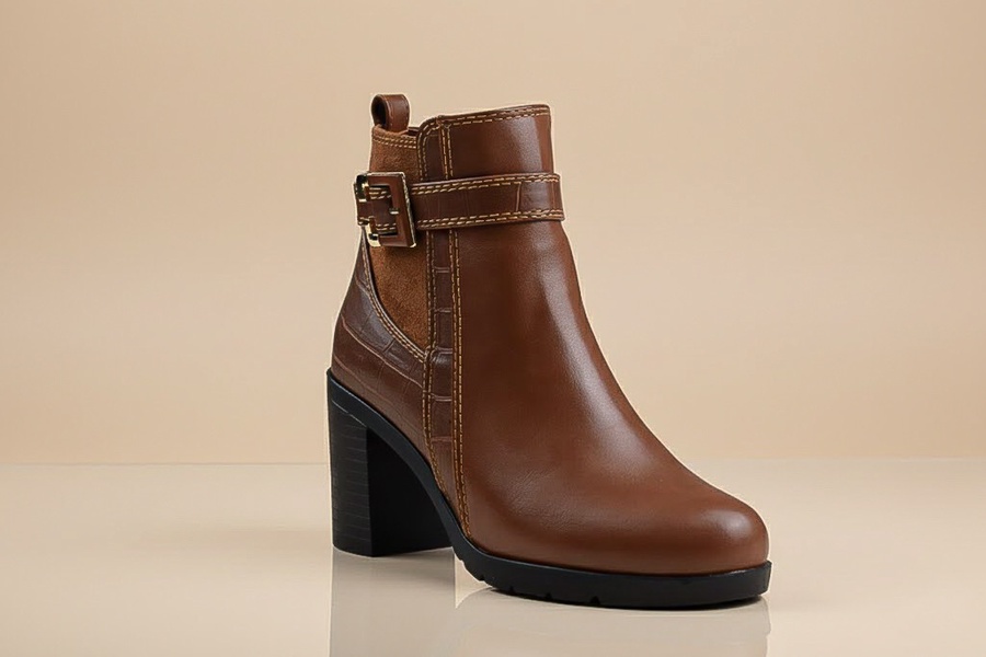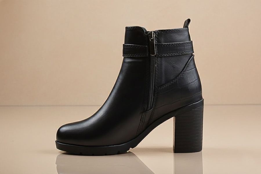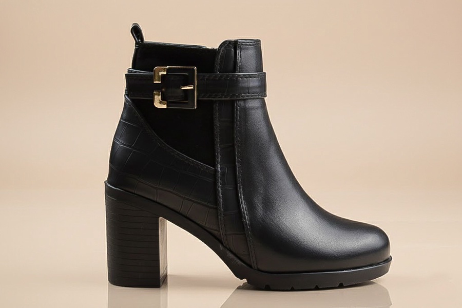 Elevate your look with this ankle boot featuring a chic mix of textures, including croc-embossing and suede. Set on a stable black chunky heel and secured with a stylish buckle strap. Perfect for adding a sophisticated, modern edge to your fall and winter ensembles.