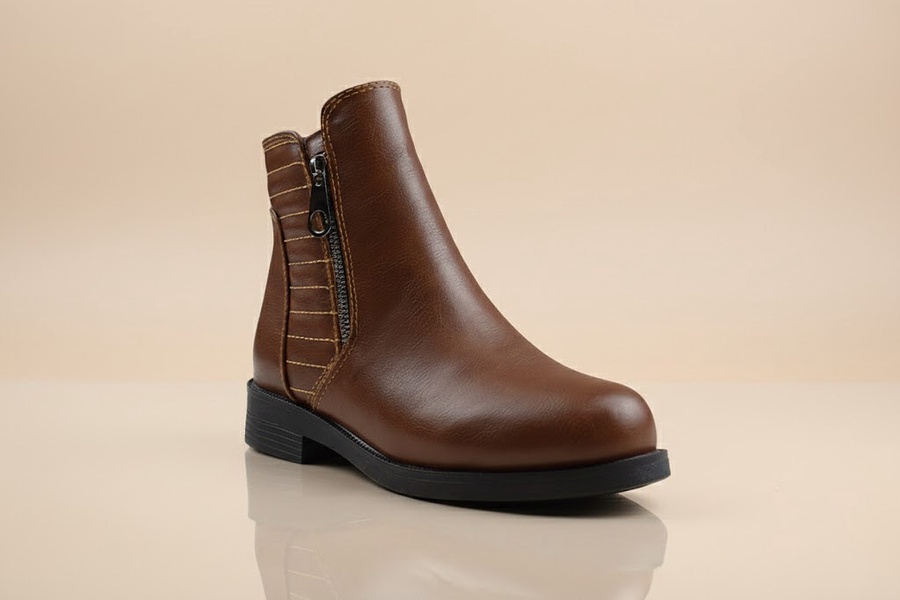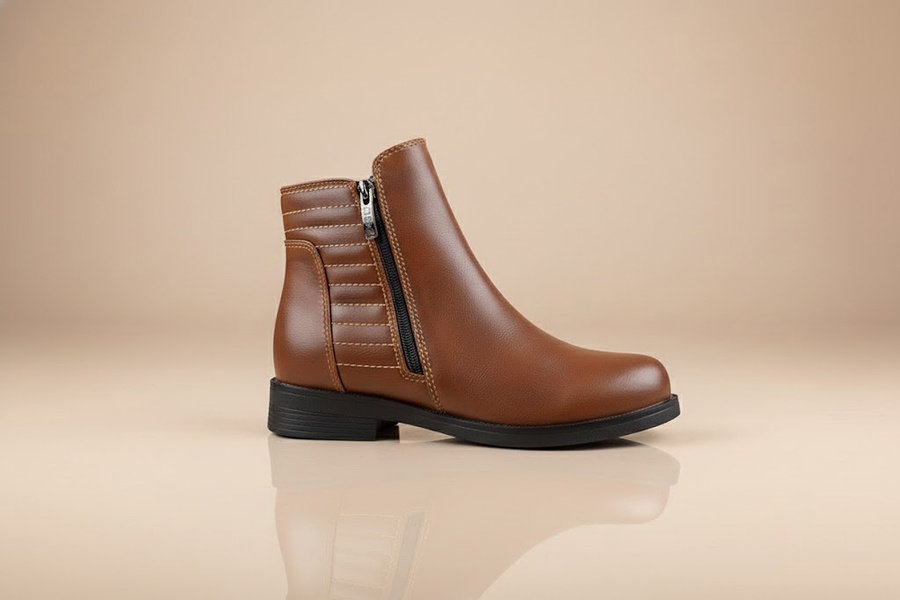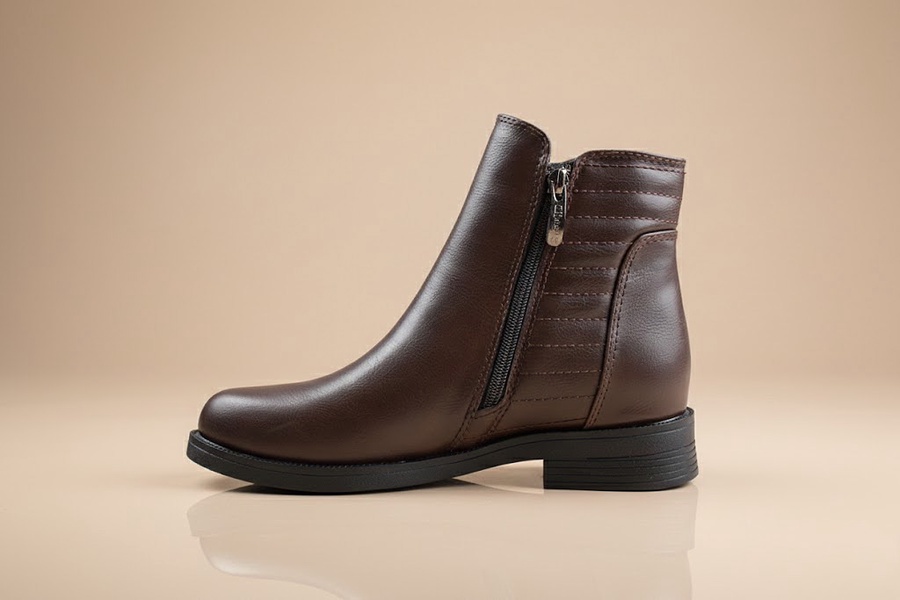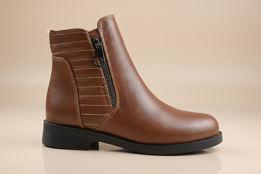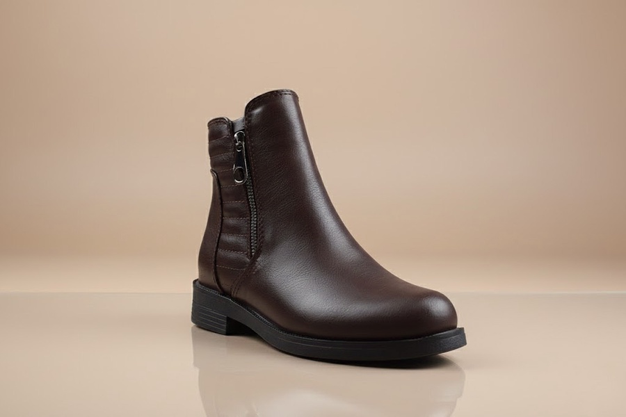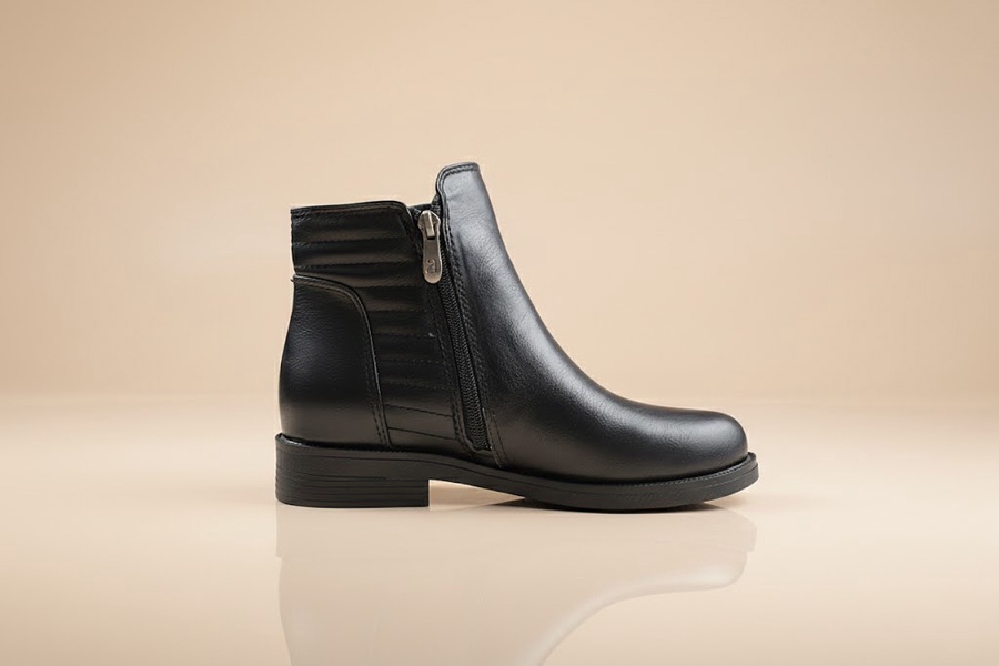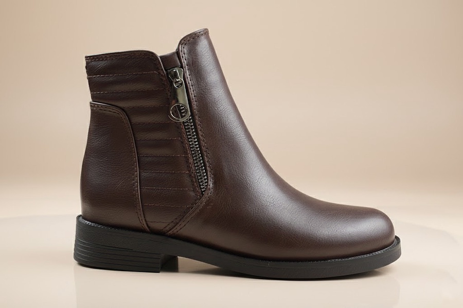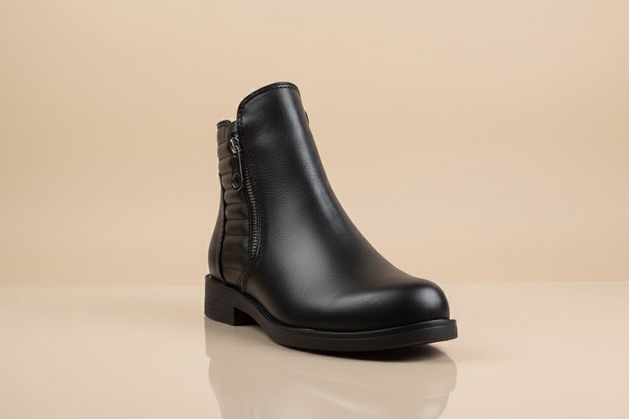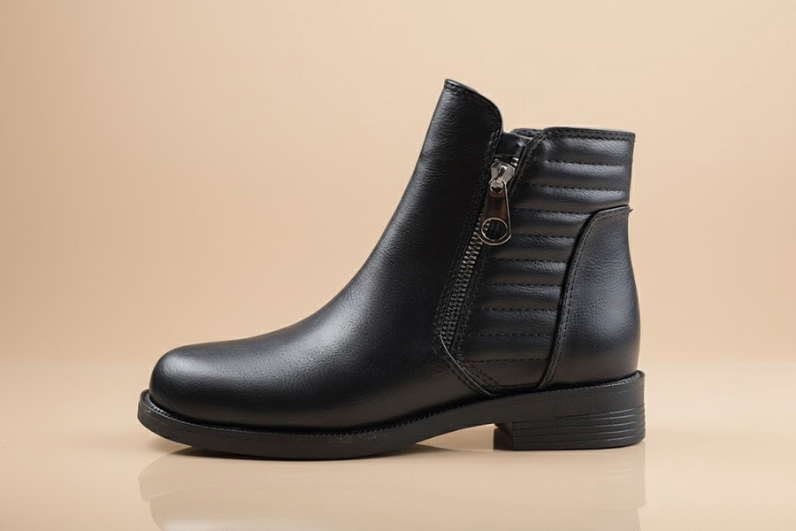 Comfortable and stylish women's half-boot with an easy-on side zipper. Features a low flat heel and chic horizontal line detailing on the ankle. Perfect for daily wear and professional settings, offering warmth and modern elegance for fall/winter