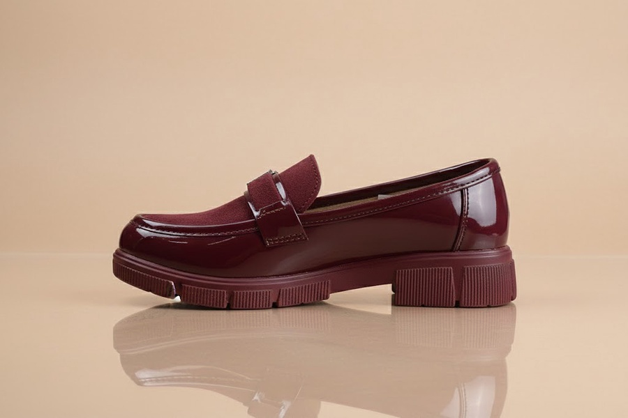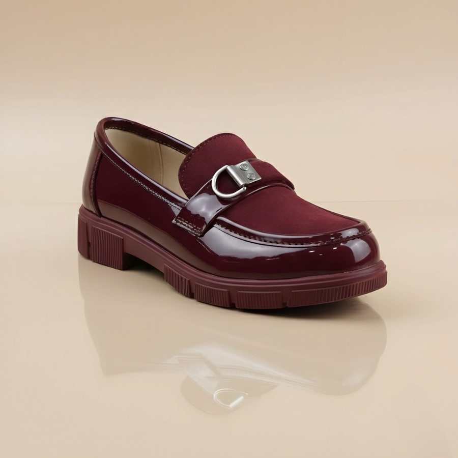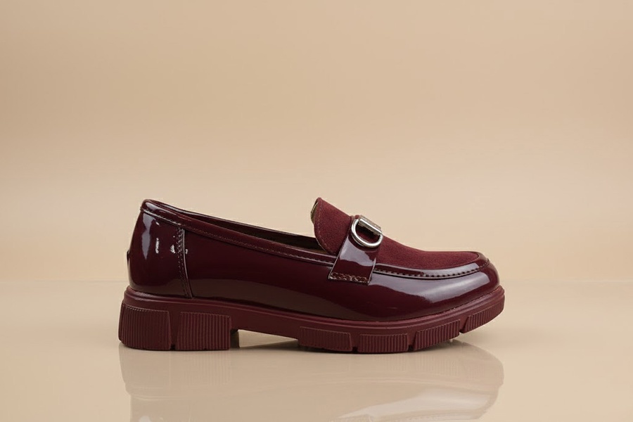 Stylish burgundy women's loafer featuring a luxurious mix of patent leather and suede, adorned with a decorative O-ring buckle. Set on a bold, comfortable chunky lug sole. Adds an edgy yet chic touch, perfect for work or stylish casual wear in the fall